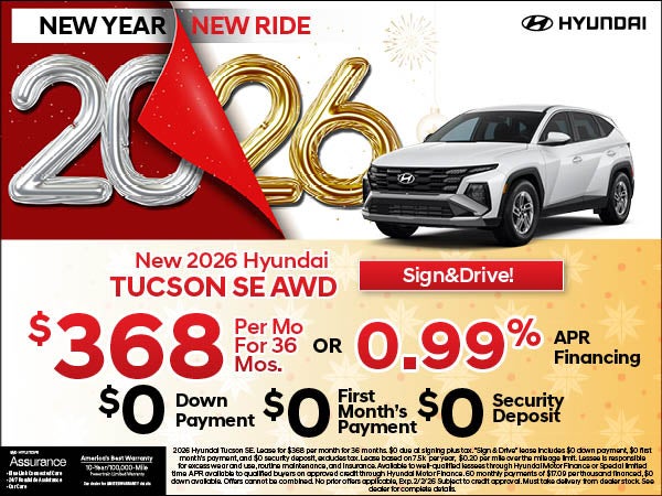 2026 Hyundai Tucson SE. Lease for $368 per month for 36 months. $0 due at signing plus tax. “Sign & Drive” lease includes $0 down payment, $0 first month’s payment, and $0 security deposit, excludes tax. Lease based on 7.5k per year, $0.20 per mile over the mileage limit. Lessee is responsible for excess wear and use, routine maintenance, and insurance. Available to well-qualified lessees through Hyundai Motor Finance or Special limited time APR available to qualified buyers on approved credit through Hyundai Motor Finance. 60 monthly payments of $17.09 per thousand financed, $0 down available. Offers cannot be combined. No prior offers applicable, Exp. 2/2/26 Subject to credit approval. Must take delivery from dealer stock. See dealer for complete details.